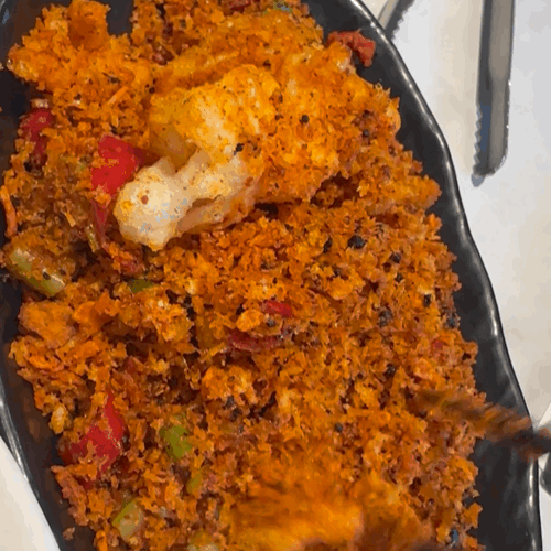 마늘새우는 바삭한 마늘 플레이크가 올라가 있어 고소하고 짭짤한 맛이 밥과 정말 잘 어울려요.