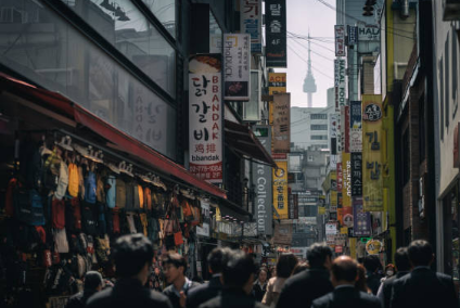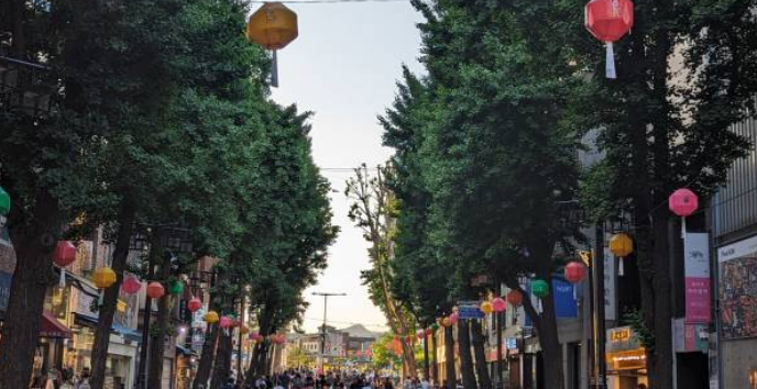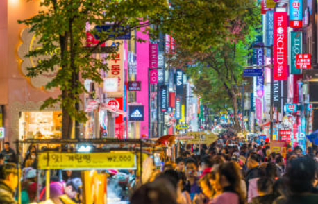 서울의 쇼핑 중심지로 화장품과 패션 브랜드가 밀집해 있습니다.
