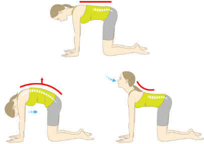 - 고양이, 소 자세 – 네 발로 기어가는 자세에서 허리를 천천히 위로 말아 올렸다가 아래로 내리는 동작 10회 반복.