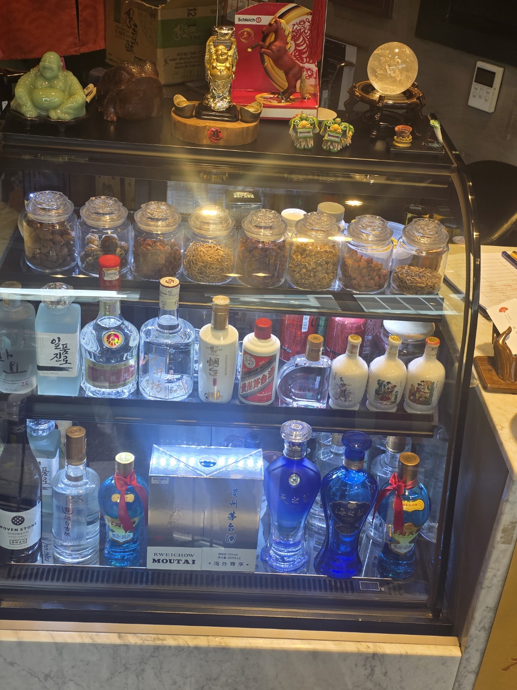 카운터 쪽에는 다양한 백주와 약재들이 진열돼 있어 중식당 특유의 분위기를 더해주고,